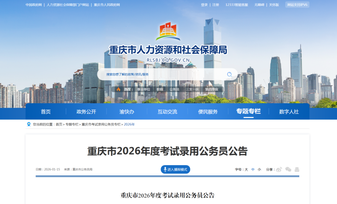 1月16日,重庆市人力社保局官方网站发布消息,重庆市公务员局将组织实施全市2026年度考试录用一级主任科员及以下和其他相当职级层次公务员工作。公告显示,本次考试计划招录4150人,2026年1月20日起报名。