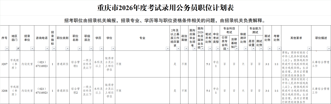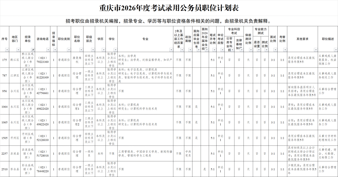 在本次招录岗位中,重庆市残联设有2个残疾人专岗,部分区县残联亦有岗位招录。有意向的报考者可重点关注。